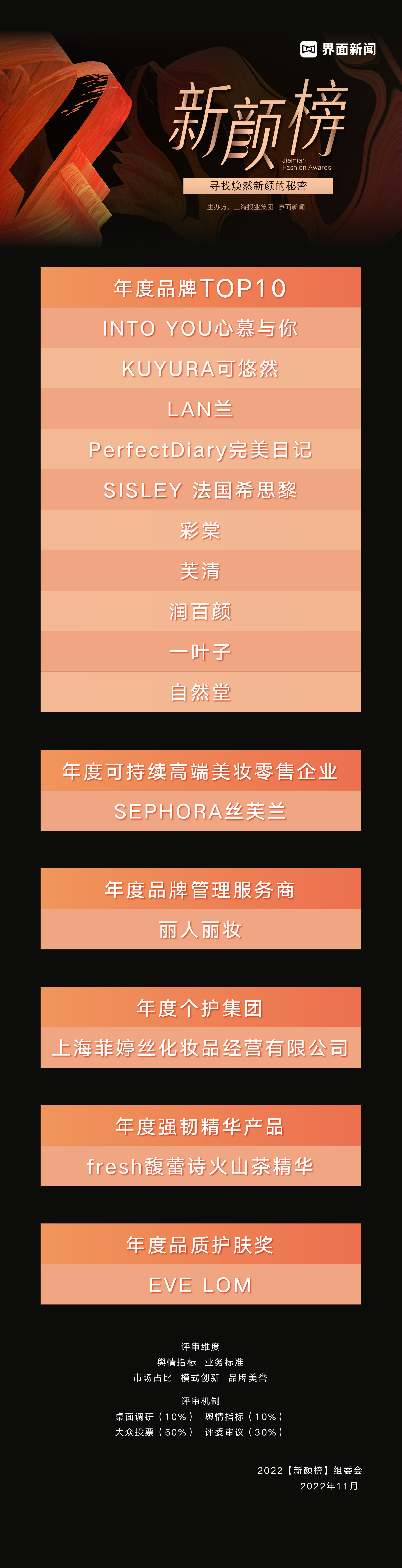 峰会现场还颁发了时尚行业两大年度奖项——新颜榜和IN势榜。两大榜单于今年7月正式启动,经过前期桌面调研、数据分析、大众投票、专家评审等环节,最终角逐出了年度品牌TOP10及单项奖荣誉。