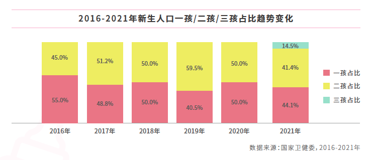 出生率持续走低,母婴市场的人群机会正在逐步迁移;二胎人群规模庞大,中大童经济大有可为。《2021 年卫生健康事业发展统计公报》数据显示,2021 年我国出生人口1062万人,其中二孩占比为41.4%,三孩及以上占比为14.5%,三胎政策下未来出生人口的上升走势仍需市场验证。