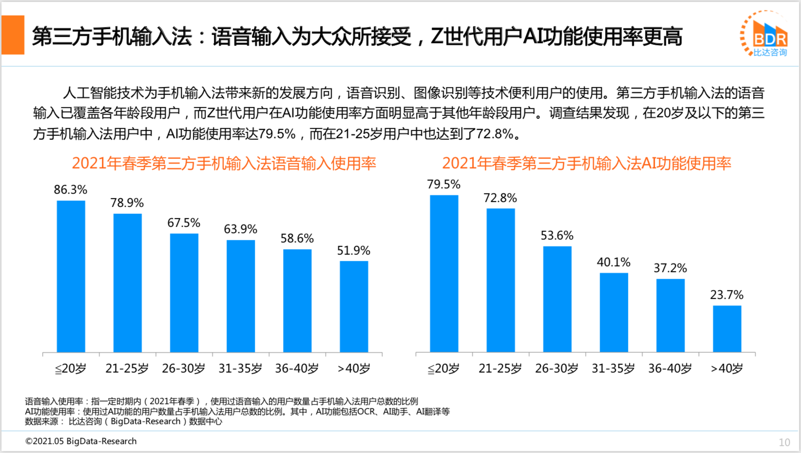 作者: 发布时间:2021-06-08 12:32:01 来源:比达网 我要评论日前,国内第三方研究机构比达咨询(BigData-Research)对外发布《2021年中国第三方手机输入法市场研究报告》。最新数据显示,2021年我国第三方手机输入法用户规模预计将达7.78亿,较去年同比增长2.9%;与此同时,第三方手机输入法用户持续向头部聚拢,市场三强格局更趋稳固;人工智能技术为手机输入法带来新的发展方向,语音识别、图像识别等技术便利用户使用。其中,成熟的语音输入已覆盖各年龄段用户,并保持快速增长。在语音输入领域,讯飞输入法凭借持续的技术引领和应用,其活跃用户保持行业领先,积极发挥示范作用。