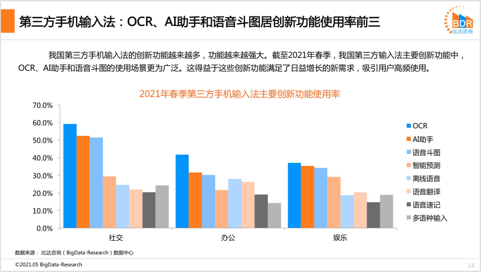 春季报数据同时显示,我国第三方输入法主要创新功能中,OCR、AI助手和语音斗图的使用场景更为广泛。这些功能维度的创新满足了日益增长的新需求,吸引用户高频使用。