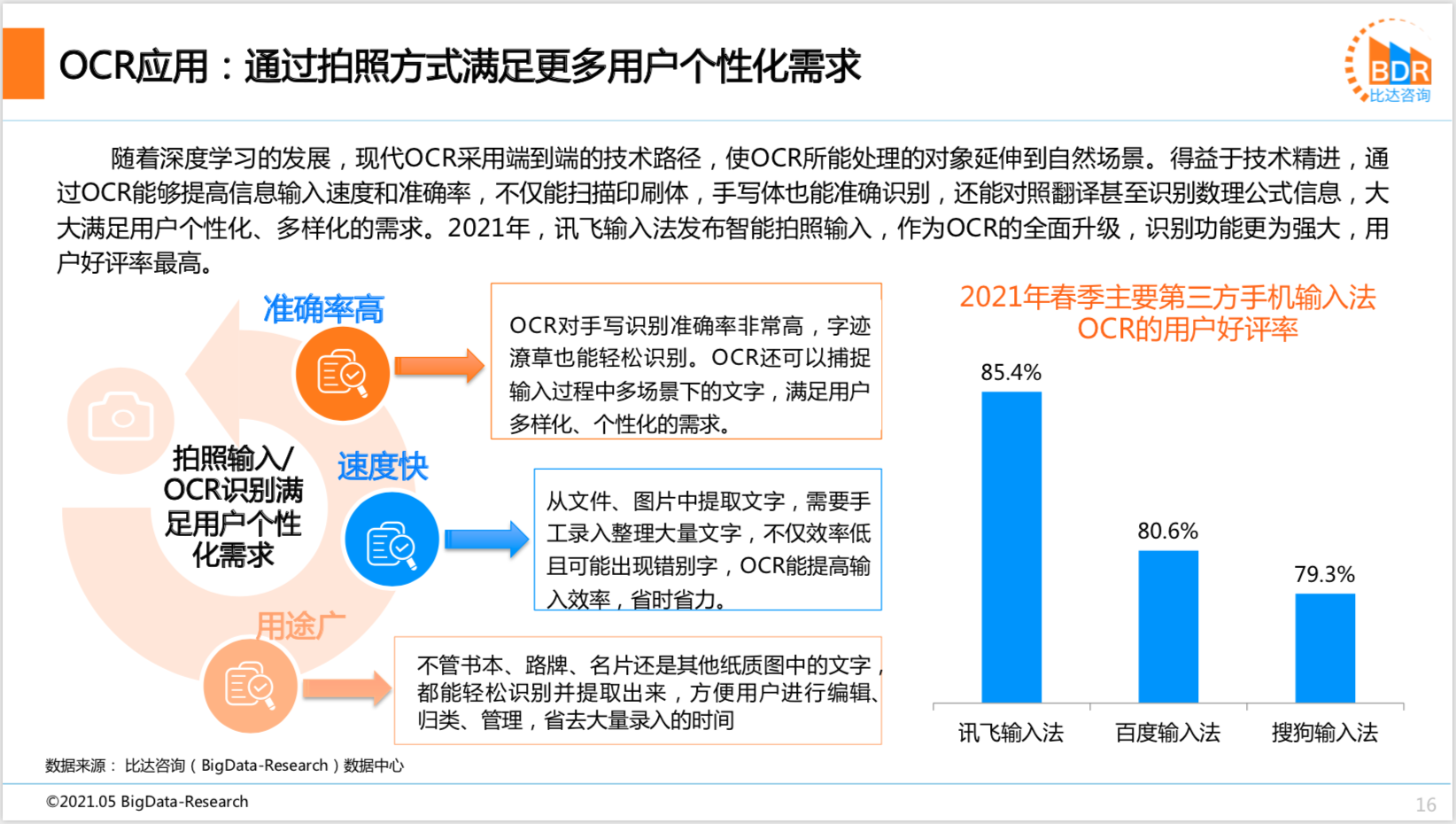 得益于技术精进,通过OCR能够提高信息输入速度和准确率,不仅能扫描印刷体,手写体也能准确识别,还能对照翻译甚至识别数理公式信息,大大满足用户个性化、多样化的需求。本季调查显示,讯飞输入法在3月发布的智能拍照输入,作为OCR的全面升级,识别功能更为强大,用户好评率高。