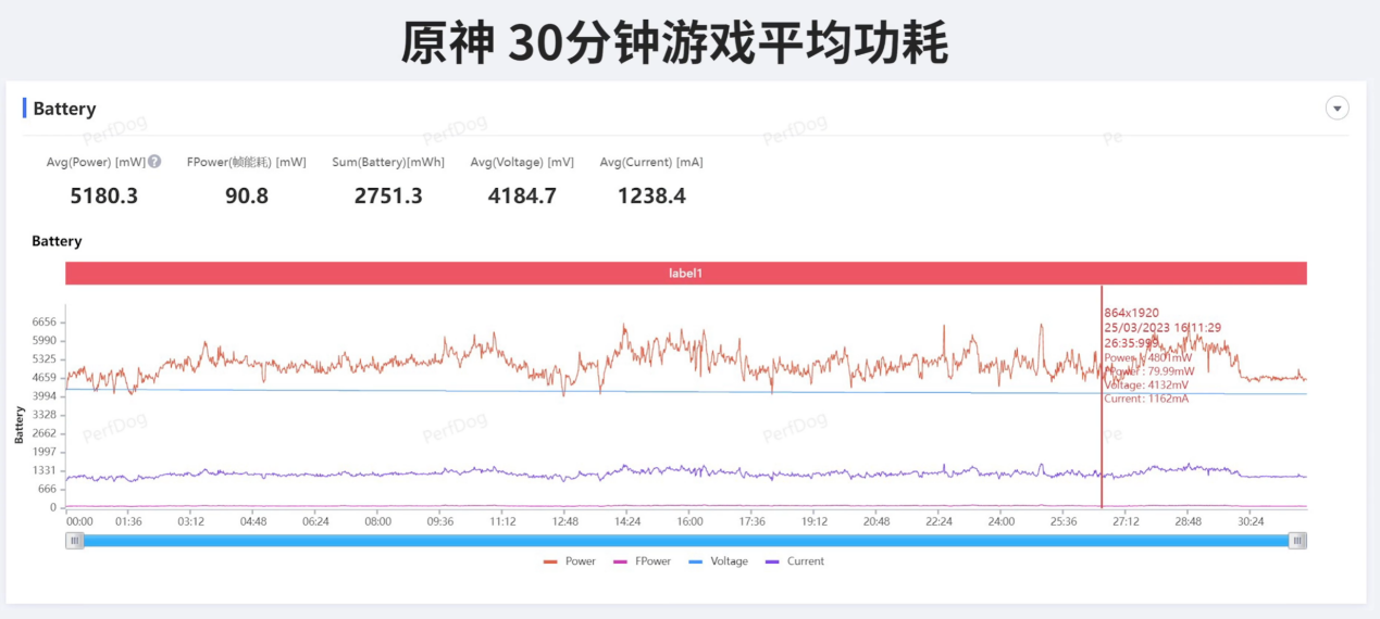 在《原神》中,游戏内最高画质是60帧,游玩30分钟后,平均帧率为57帧,前15分钟的表现尤为突出。15分钟后帧率虽有所下降,但波动不大,还是相对平稳。耗电量13%,正面温度43.8度,背面温度42.8度,表现尚可。