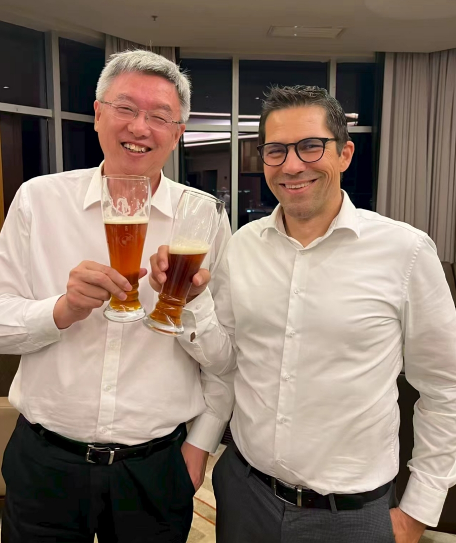 宝马高层赠送亿纬锂能董事长纪念啤酒杯