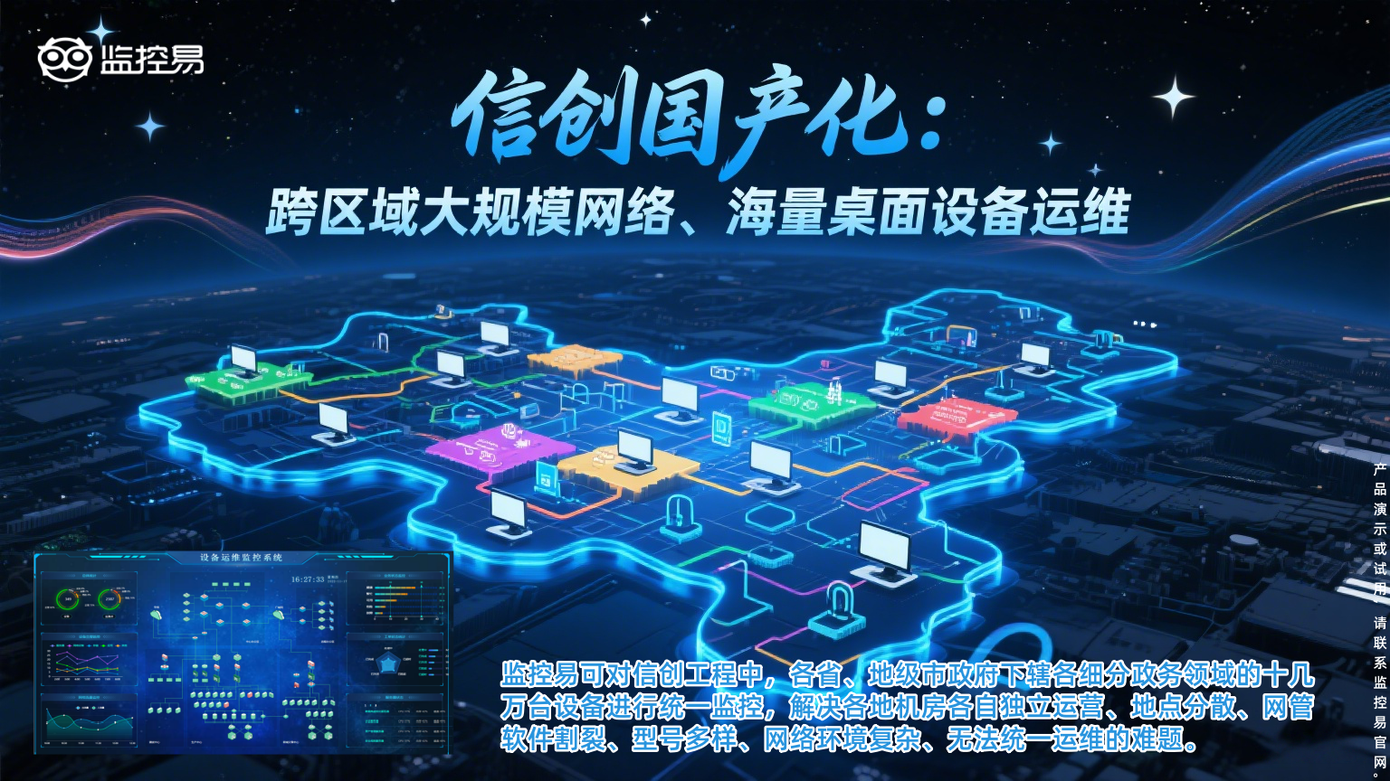 信创适配不是“能不能连”,而是“能不能管好”。拼凑式方案只能解决“有”的问题,深度适配方案才能解决“好用、可管、可控”的问题。监控易智能一体化运维平台凭借全栈自主研发和持续积累的适配能力,帮助用户在信创环境下实现与x86环境一致的监控体验,让国产化替代真正落地见效。